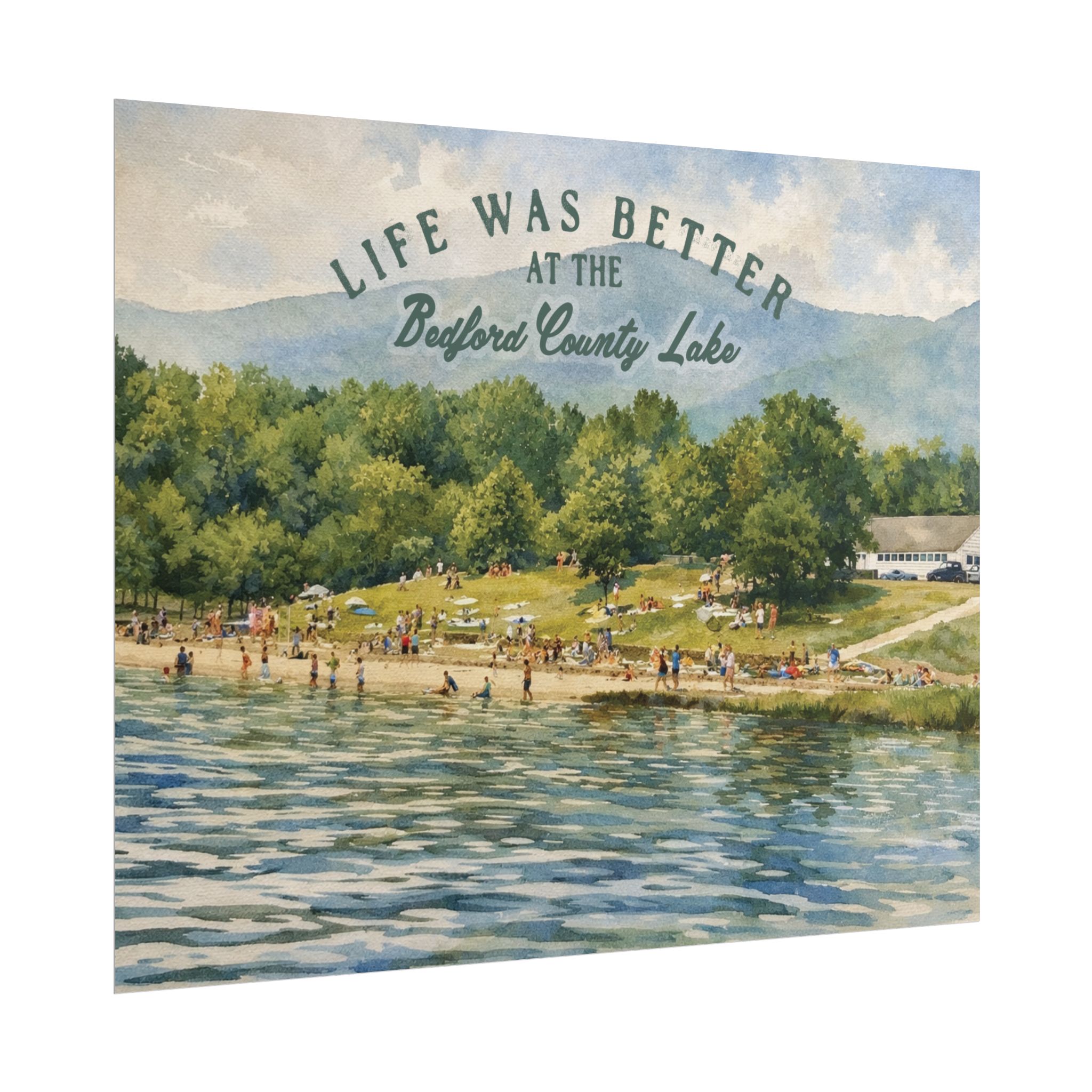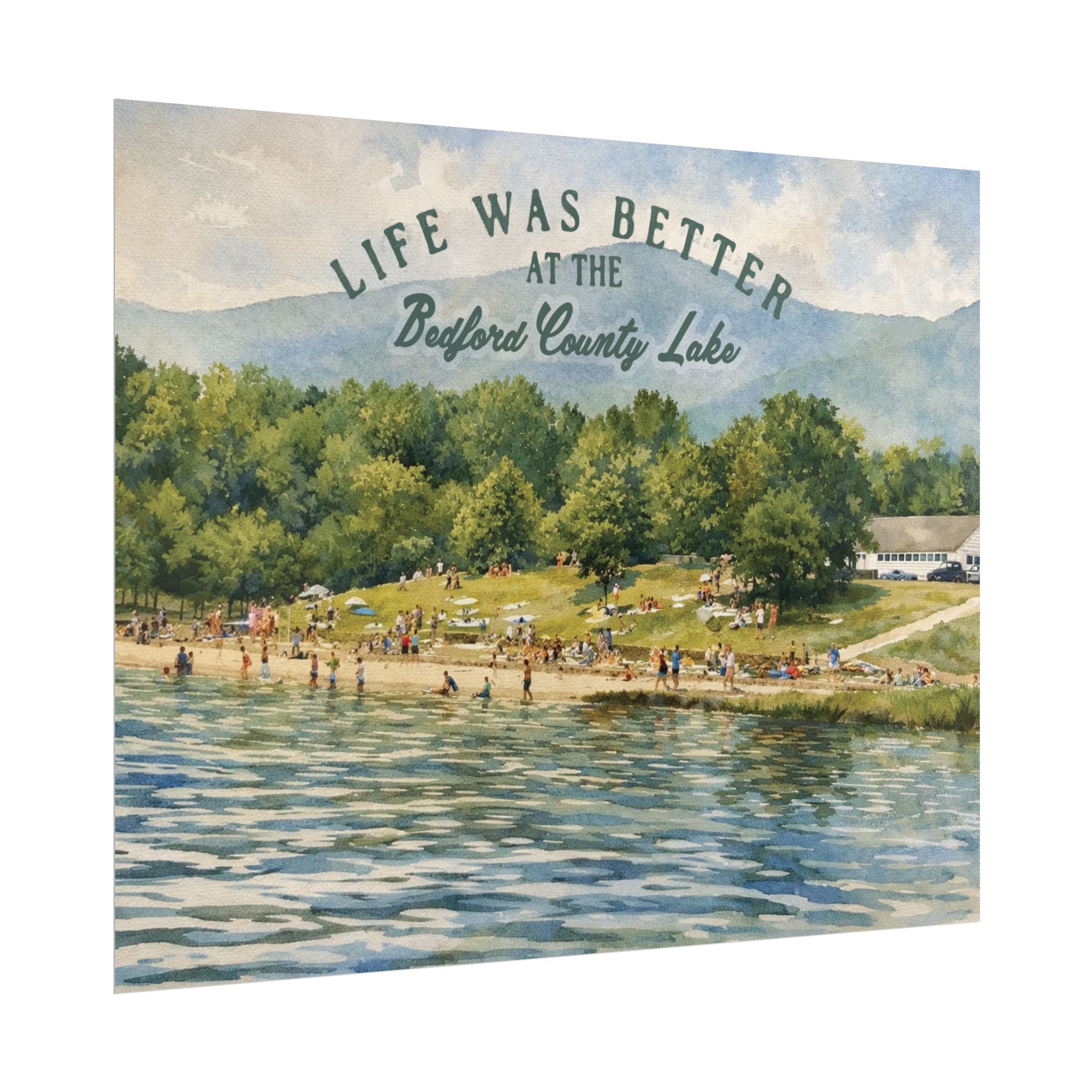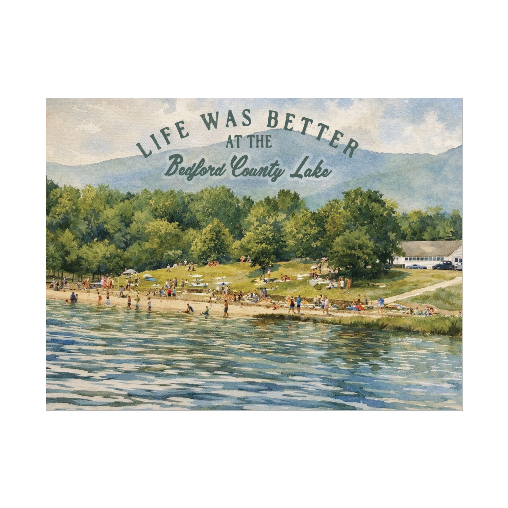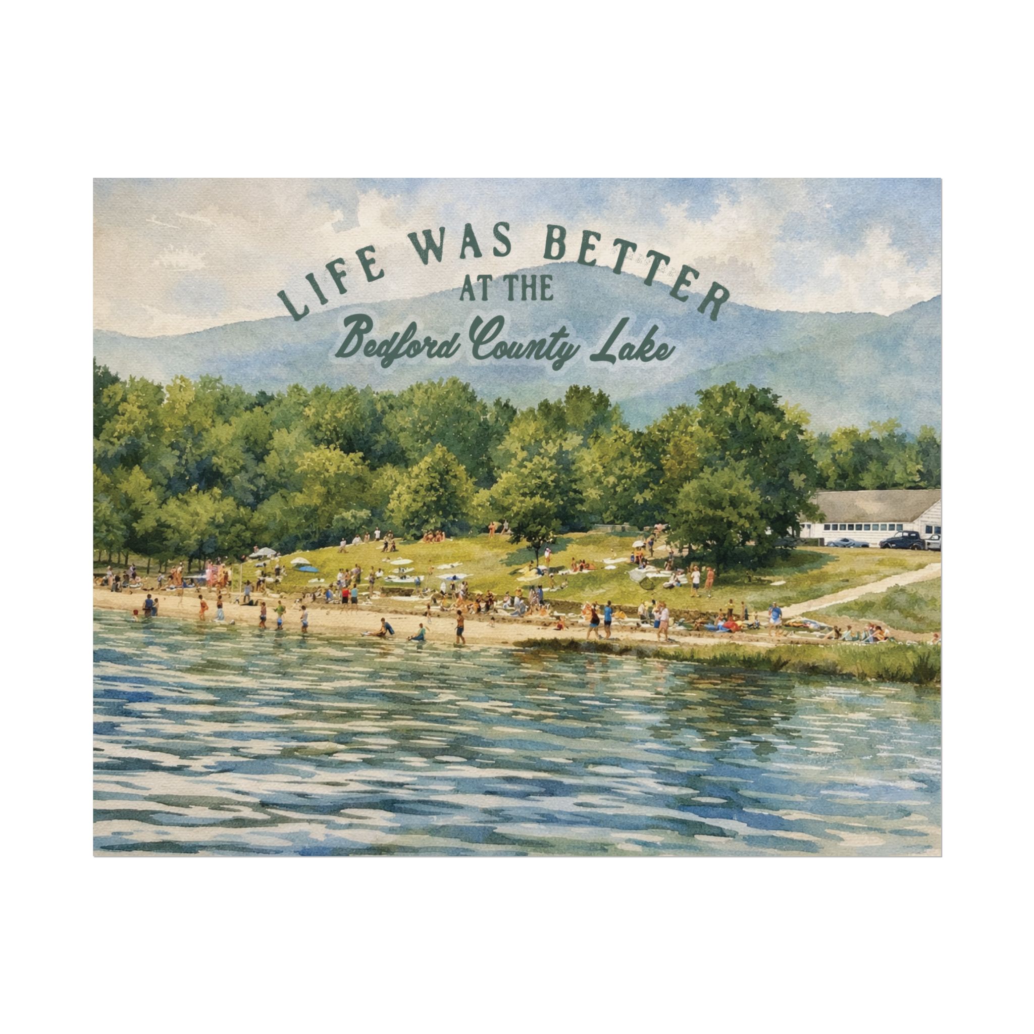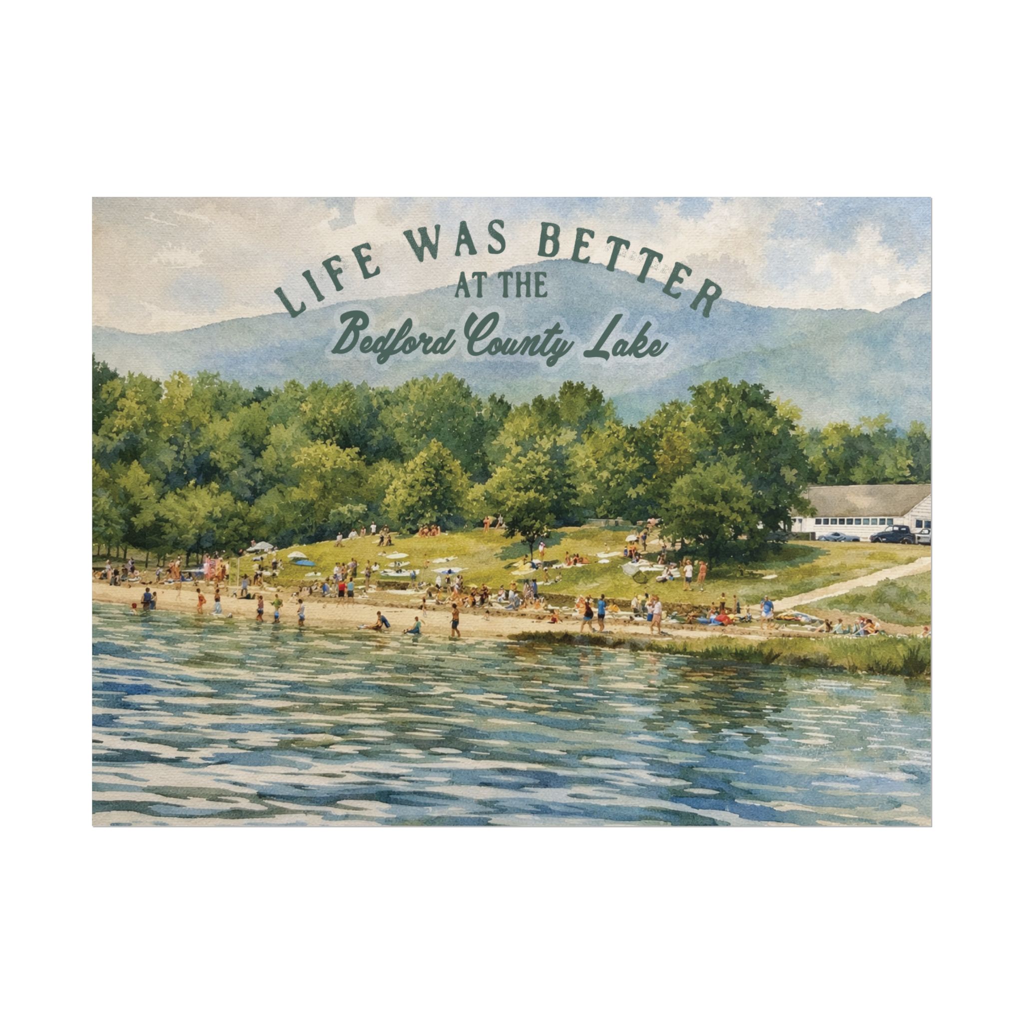 Capture a nostalgic piece of Bedford County history with this vintage 1960s lake print. This watercolor remake features a lively summer scene along the shoreline, with swimmers, sunbathers, and families enjoying the water against a beautiful mountain backdrop. The image has a timeless charm that reflects the simple joys of lake days in decades past.
