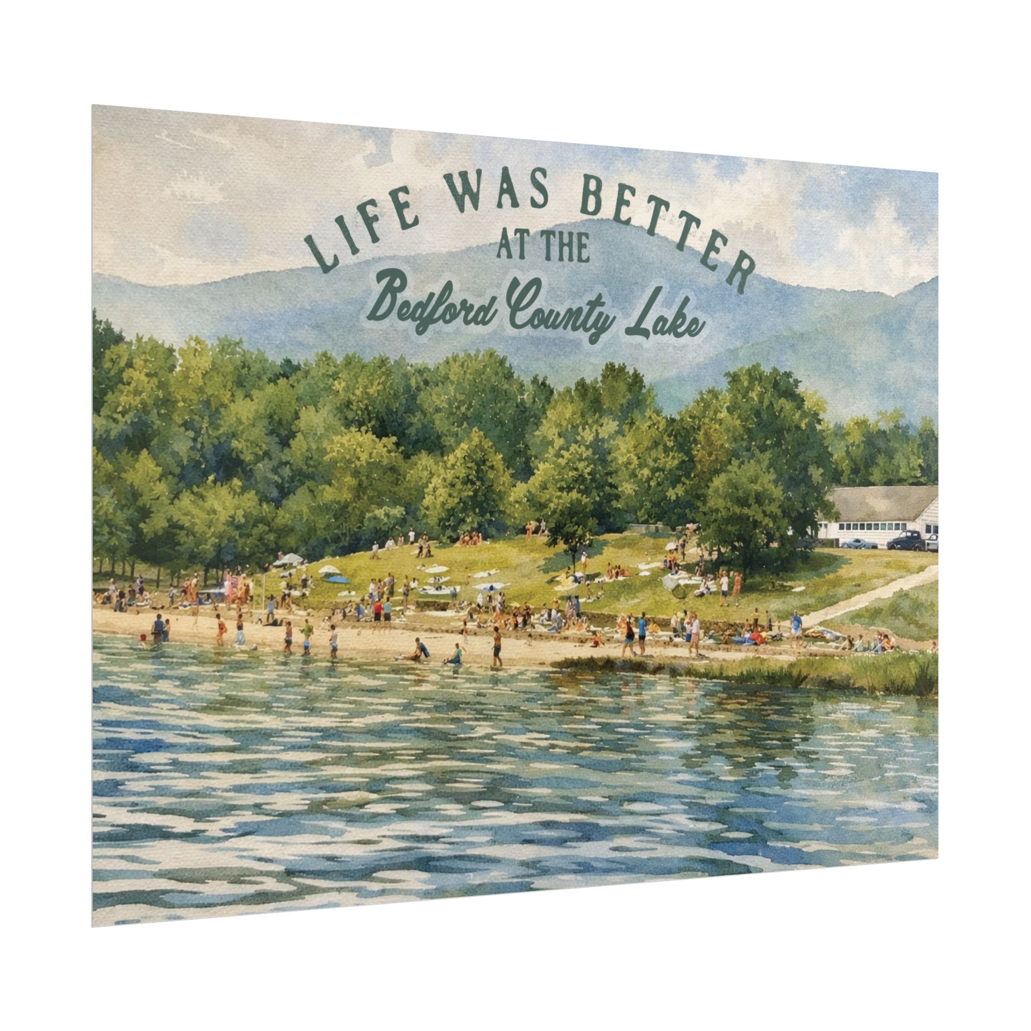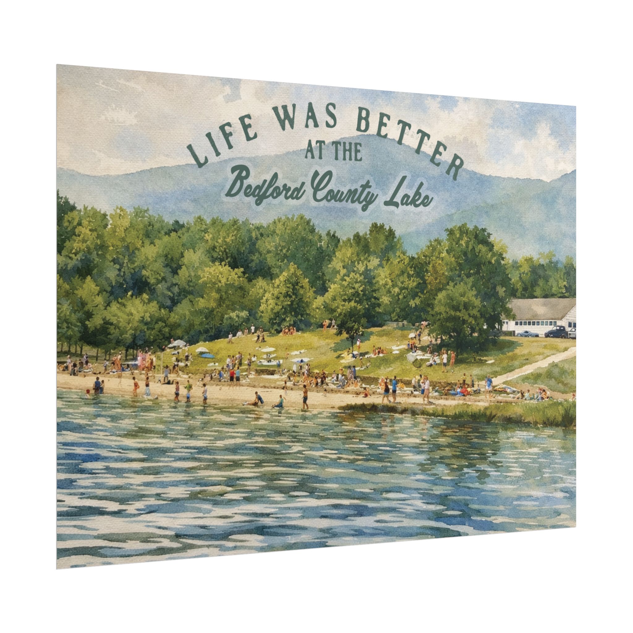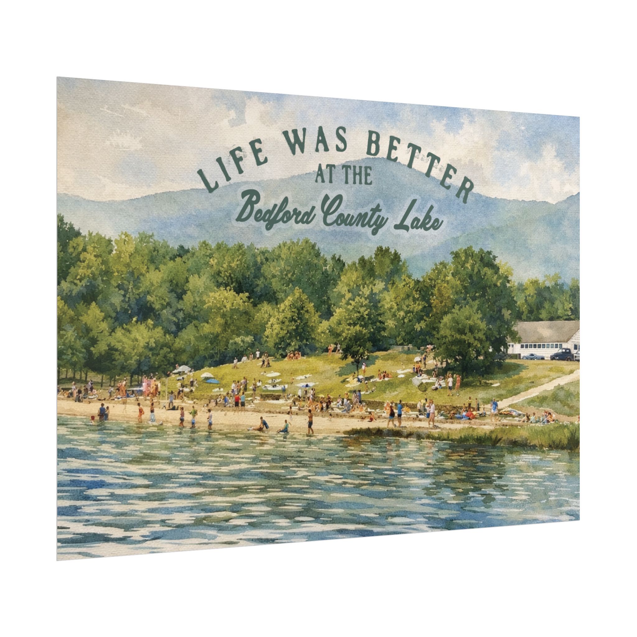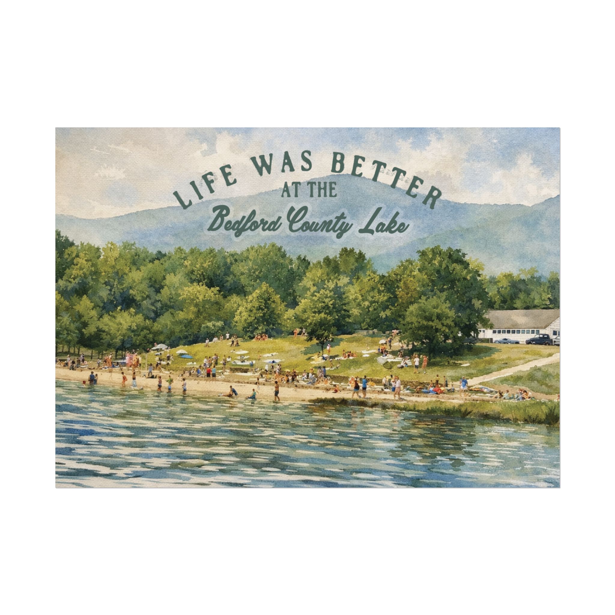 Capture a nostalgic piece of Bedford County history with this vintage 1960s lake print. This watercolor remake features a lively summer scene along the shoreline, with swimmers, sunbathers, and families enjoying the water against a beautiful mountain backdrop. The image has a timeless charm that reflects the simple joys of lake days in decades past.