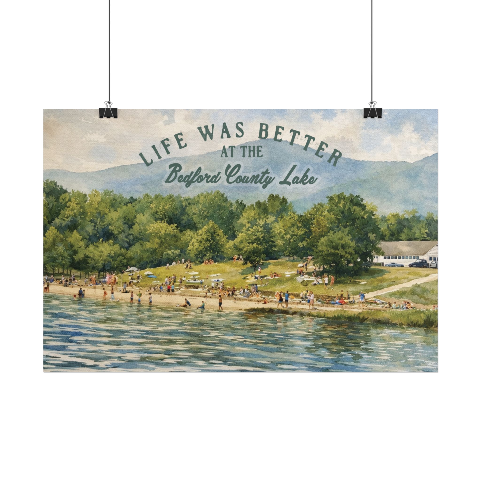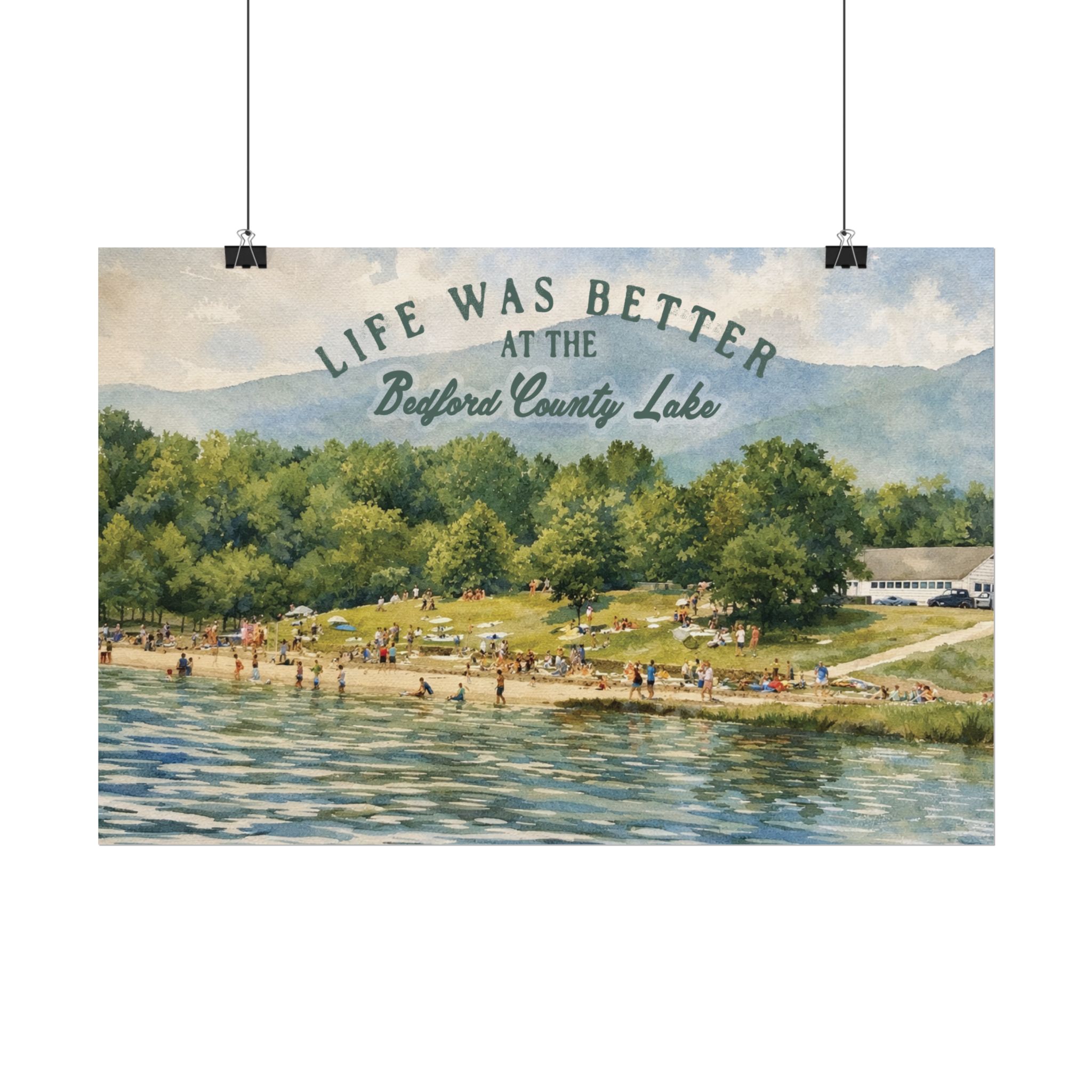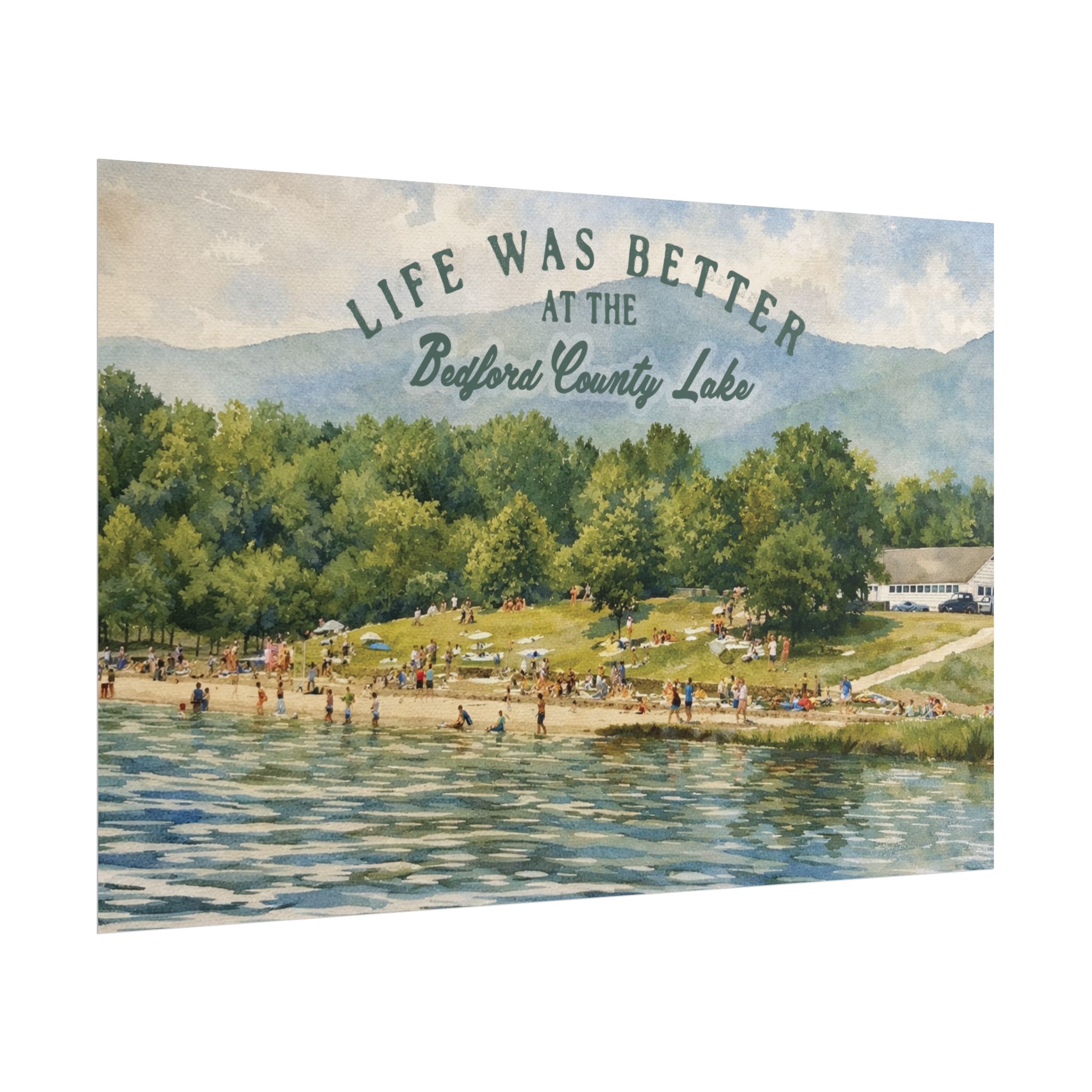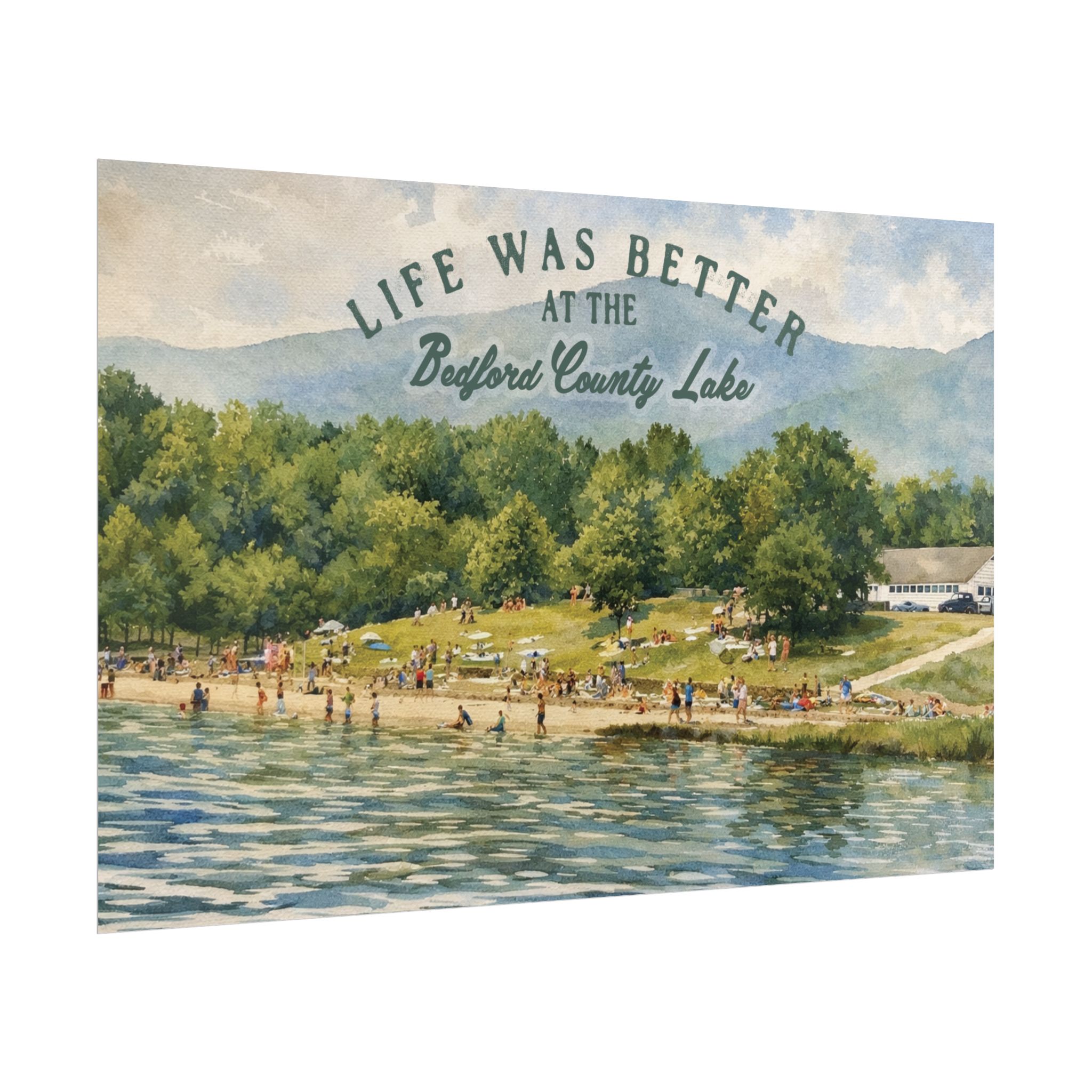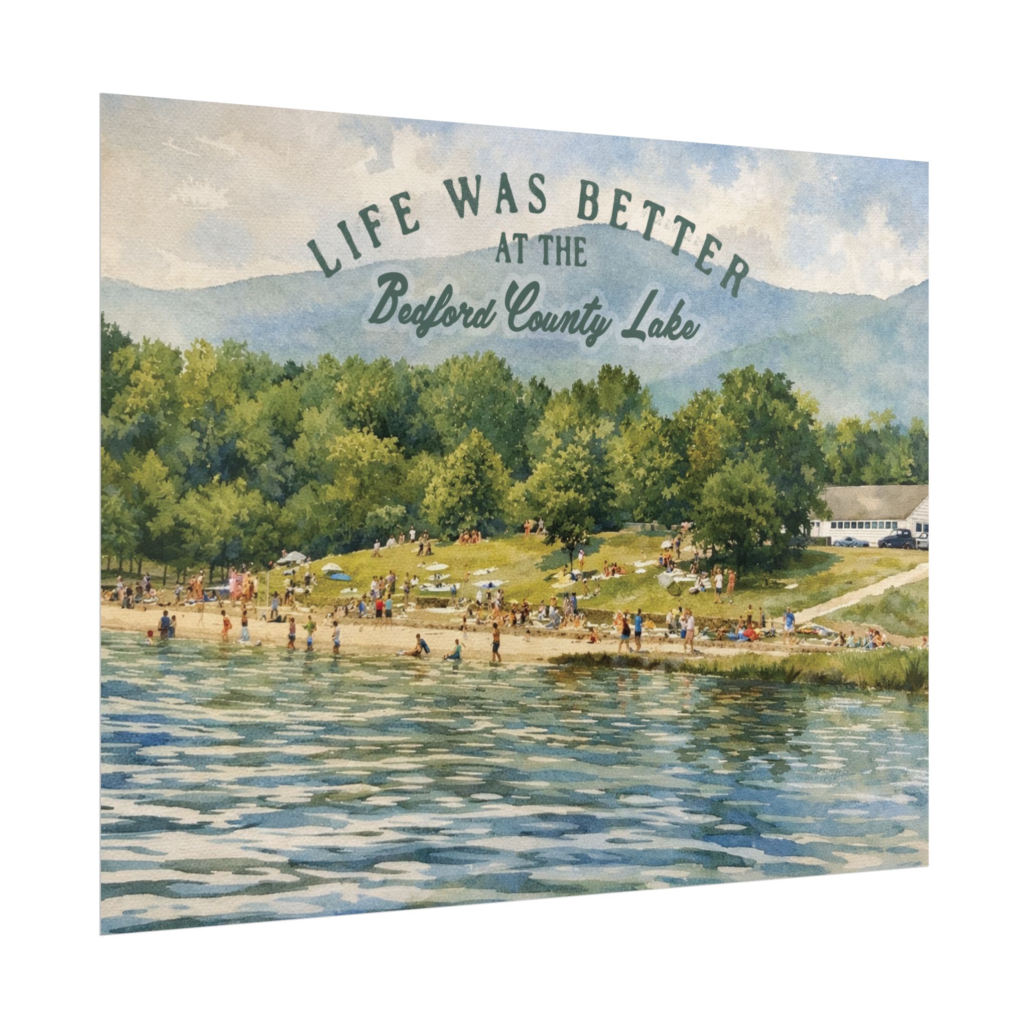 Capture a nostalgic piece of Bedford County history with this vintage 1960s lake print. This watercolor remake features a lively summer scene along the shoreline, with swimmers, sunbathers, and families enjoying the water against a beautiful mountain backdrop. The image has a timeless charm that reflects the simple joys of lake days in decades past.