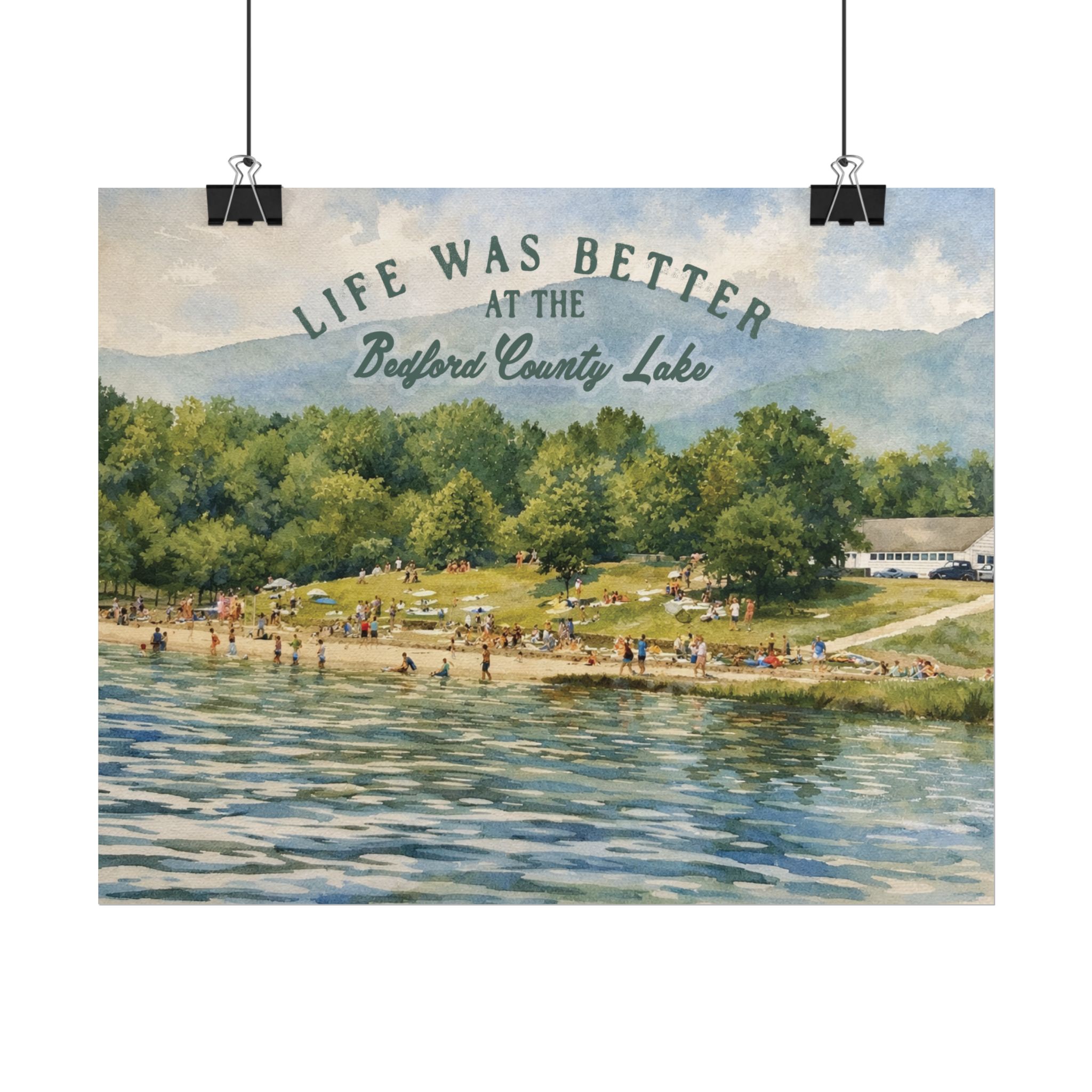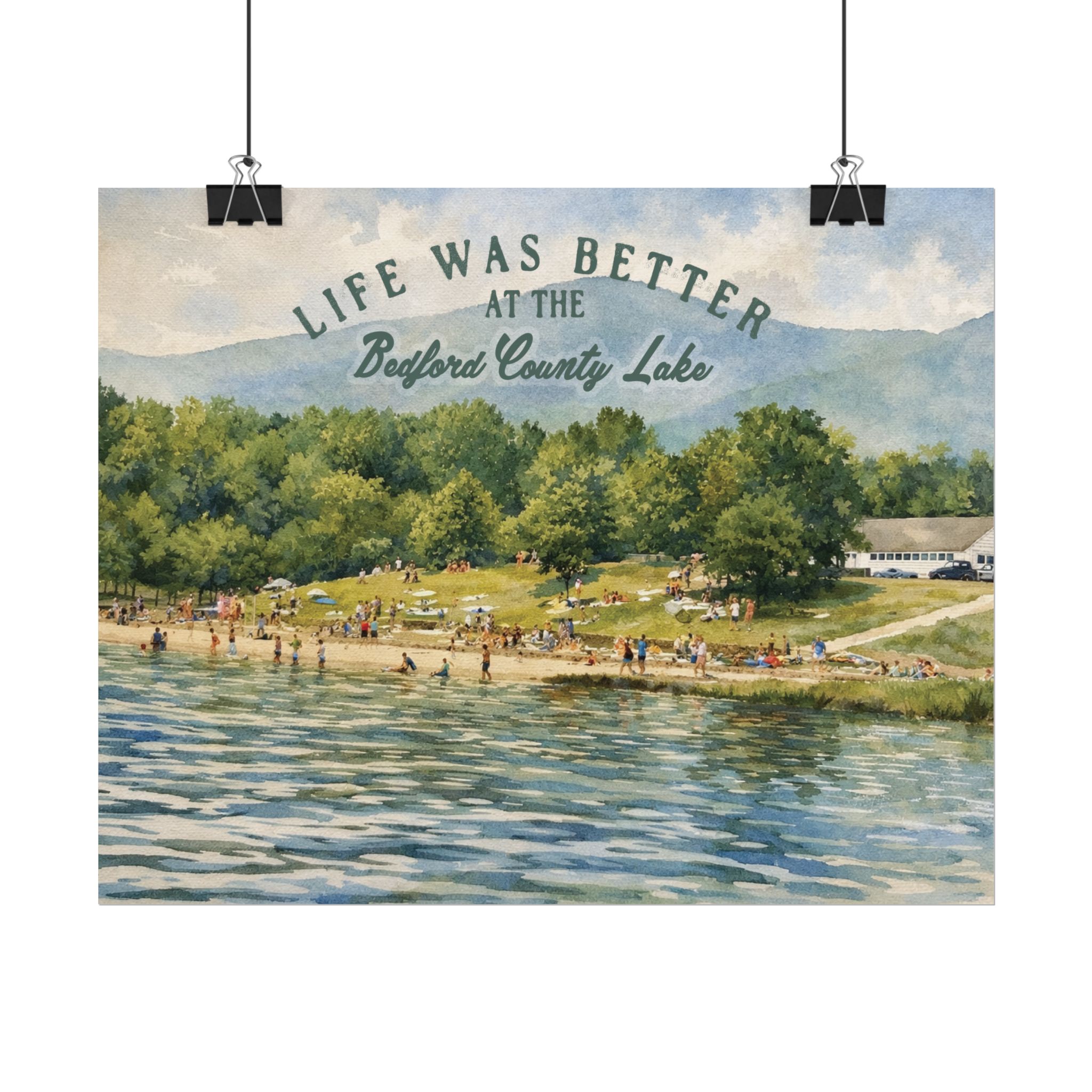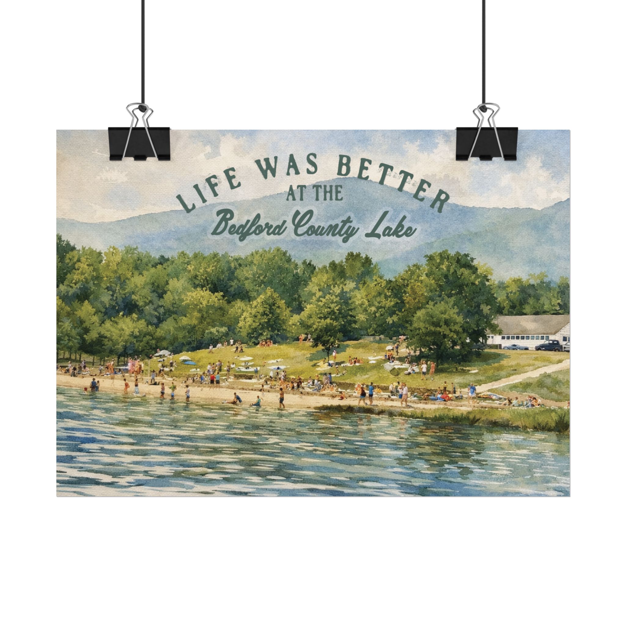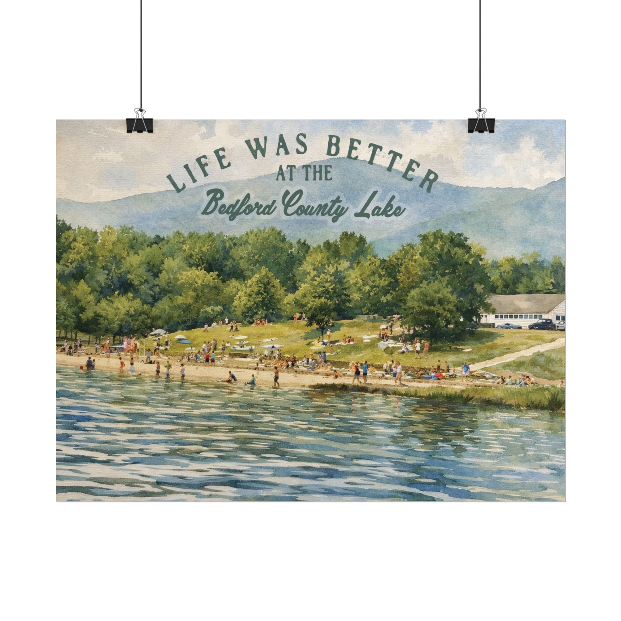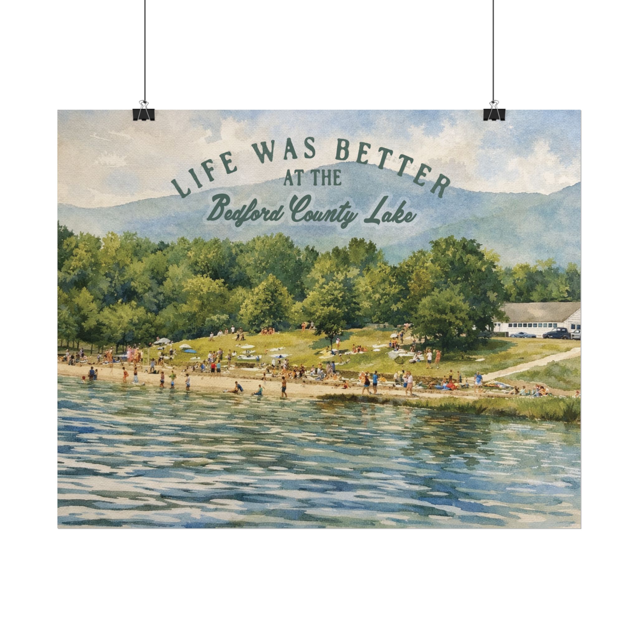 Capture a nostalgic piece of Bedford County history with this vintage 1960s lake print. This watercolor remake features a lively summer scene along the shoreline, with swimmers, sunbathers, and families enjoying the water against a beautiful mountain backdrop. The image has a timeless charm that reflects the simple joys of lake days in decades past.