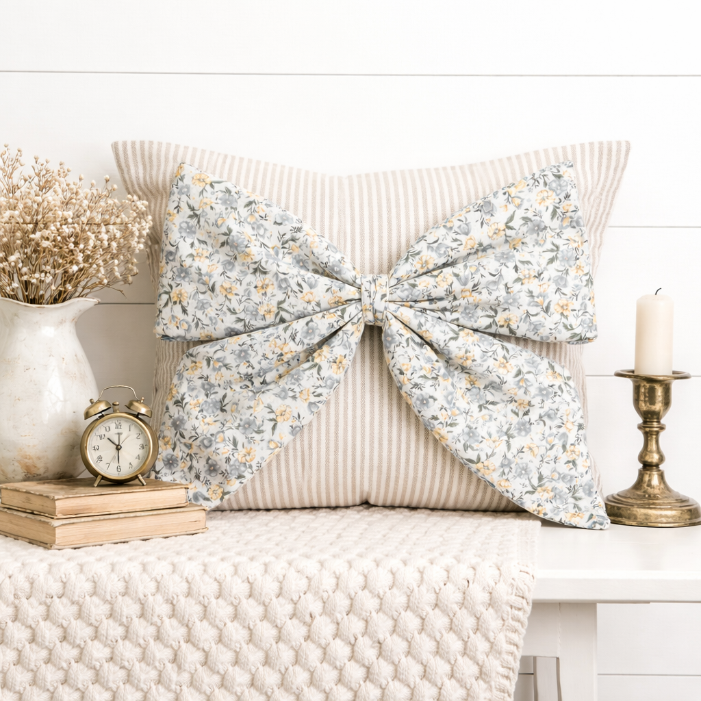 Interchangeable Snap-It bow crafted from soft blue & yellow vintage floral fabric, designed to snap onto Snap-It pillows and Snap-It bags. Handmade accent décor for seasonal and everyday styling.