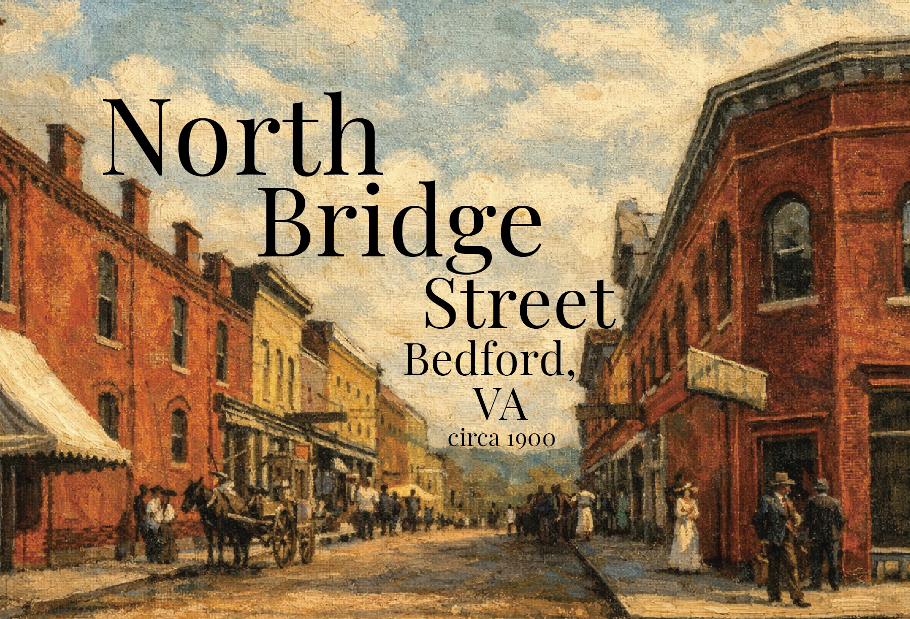 This design was inspired by a vintage postcard depicting North Bridge Street in Downtown Bedford around the turn of the century. It reflects a time when life moved a little slower and community was at the center of everyday living — a reminder of the beauty found in honoring where we come from.
