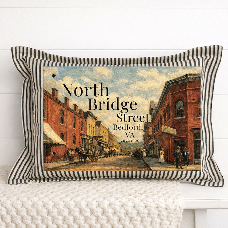 This interchangeable Snap-It pillow graphic features an original design inspired by a 19th-century impressionist–style painting of North Bridge Street in Downtown Bedford, VA, circa 1900. Based on a vintage Bedford postcard, this design reflects the heart behind All Good Things — preserving history through meaningful, handmade art.