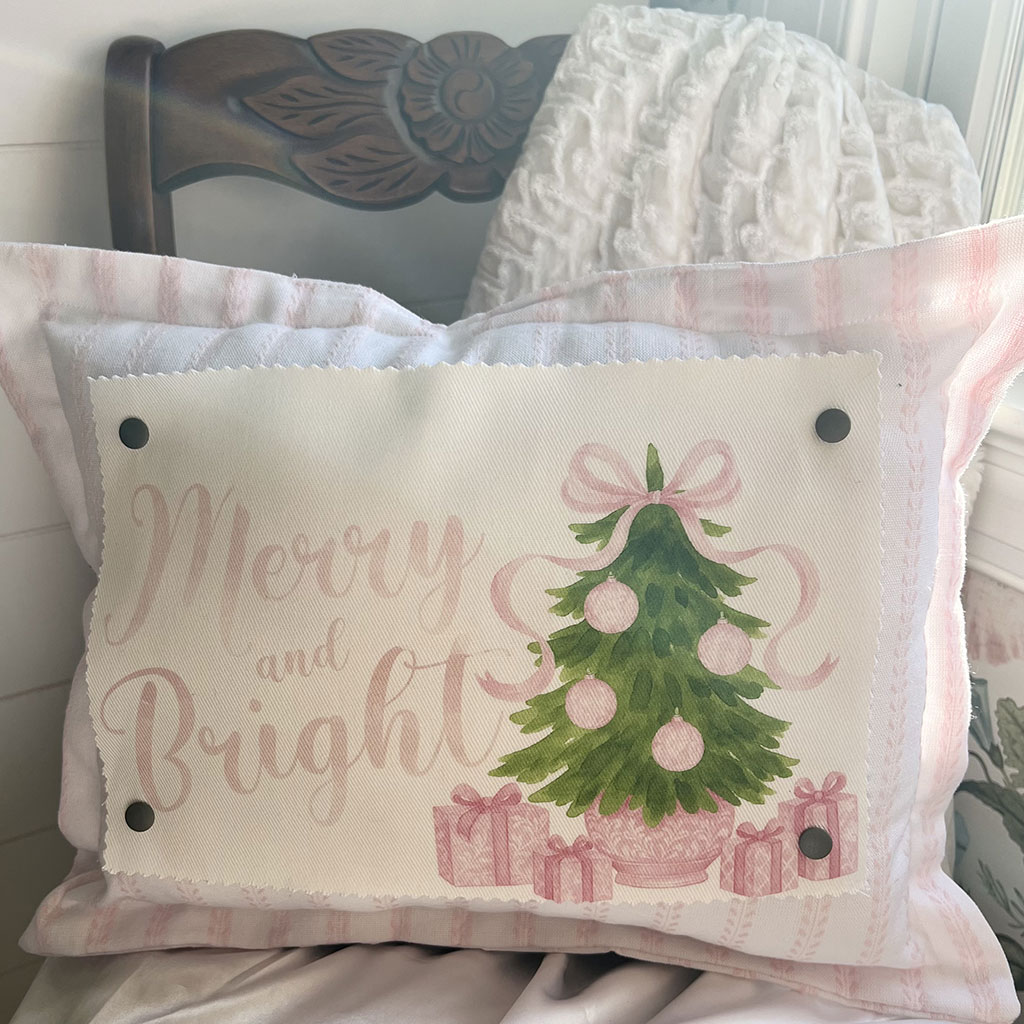 This interchangeable Snap-It pillow graphic features a cheerful Christmas design with Merry and Bright lettering, a festive tree adorned with pink ornaments, bows, and gifts. Created for those who love a softer, playful holiday palette, this design reflects joy, creativity, and festive charm.