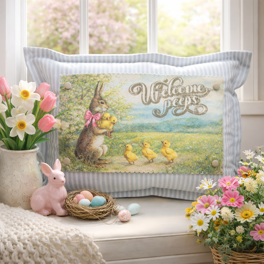 Bring a playful vintage Easter feel to your home with this charming design featuring a bunny, baby chicks, and the cheerful phrase “Welcome Peeps.” With soft countryside colors and whimsical seasonal artwork, this Snap-It graphic makes a fun statement for spring decorating.